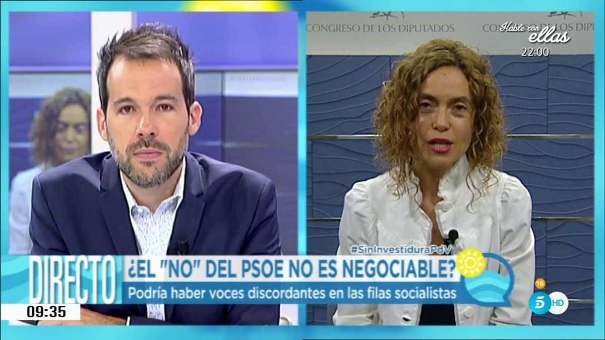 08/08/201610:02 h.Metritxell Batet, secretaria de estudios y programas del PSOE, ha entrado en directo en 'El Programa del verano' para hablar de la investidura. "No queremos terceras elecciones, queremos que el señor Rajoy sea capaz de conformar gobierno con aquellas fuerzas políticas con las que después negocia las políticas concretas. La posición del PSOE no es una cuestión táctica, es una cuestión de convinciones", ha asegurado cuando se le ha preguntado por el "no" de Pero Sánchez a Mariano Rajoy.
