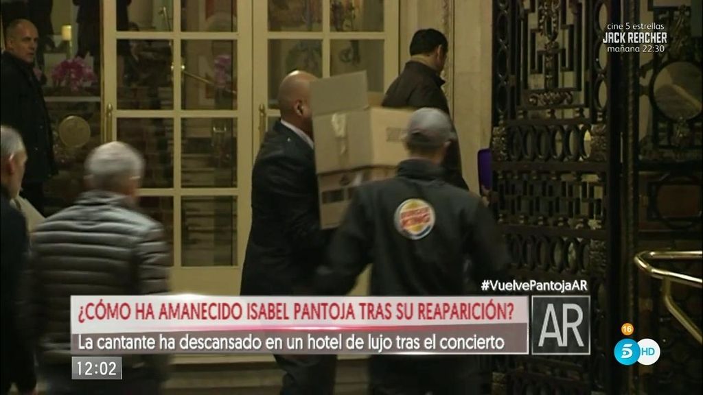 Tras la triunfal reaparición de Isabel Pantoja en el Teatro Real de Aranjuez, la cantante se trasladó al Palace, un hotel de lujo donde pidió hamburguesas por encargo para un regimiento. A la salida ni Kiko, ni Chabelita, ni el hermano de Pantoja quisieron hacer declaraciones sob re el concierto.