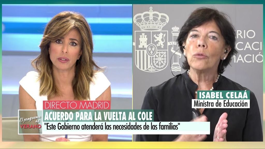 La ministra de Educación Isabel Celaá ha comparecido en 'El programa del verano' para analizar cómo va a ser la vuelta al colegio a partir de septiembre y explicar a Ana Terradillos y colaboradores cómo fue la reunión del pasado 27 de agosto entre los miembros del Gobierno para definir todas las pautas a seguir en los centros educativos.