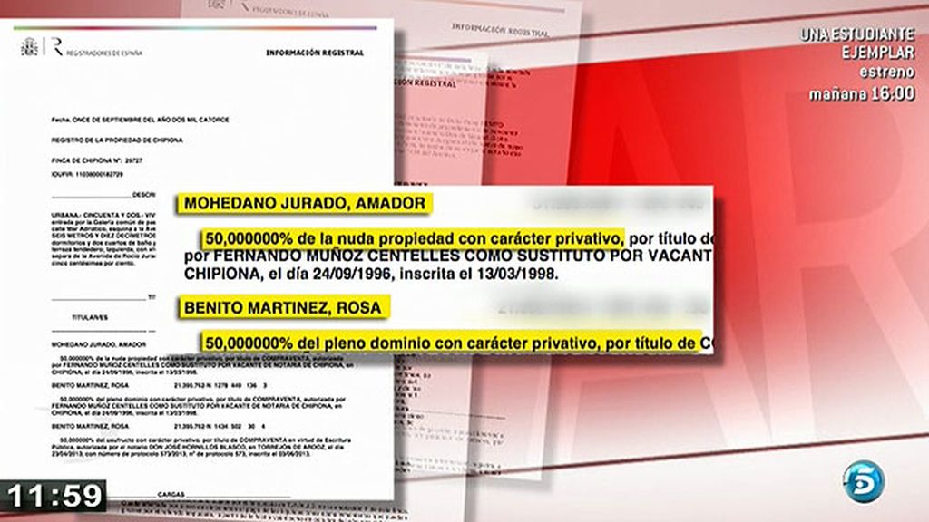 Tras meses de polémica sobre la propiedad del ático de Chipiona, Antonio Rossi ha tenido acceso a la nota simple de la vivienda. Según ha revelado Rossi, el ático se compra en 1996 a partes iguales y se inscribe dos años después. Diecisiete años después, el 23 de abril de 2013 Rosa Benito compra a Amador su 50% de uso y disfrute, convirtiéndose así en propietaria al 100% del uso y disfrute del piso mientras que Amador, únicamente mantiene el 50% de la propiedad. Además, en la nota simple aparece la tasación oficial de la vivienda, mucho menor que el precio por el que Rosa y Amador pretenden vender la vivienda. Según ha revelado Antonio Rossi, el ático está tasado en 119.000, un precio muy alejado de los 450.000 euros que han puesto como precio de venta.