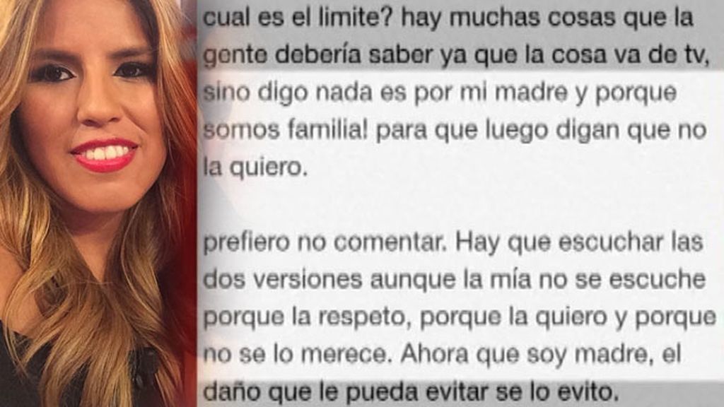 Aunque cansada de los comentarios hirientes de su hermano, Chabelita "Si no digo nada es por mi madre y porque somos familia. ¡Para que luego digan que no la quiero! Prefiero no comentar. Hay que escuchar las dos versiones aunque la mía no se escuche porque la respeto, porque la quiero y porque no se lo merece. Ahora que soy madre, el daño que le pueda evitar, se lo evito", ha escrito la hija de Isabel Pantoja.