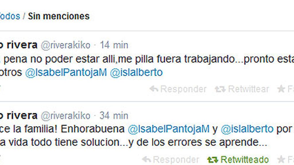 El nacimiento del pequeño Alberto Isla Pantoja parece haber hecho recapacitar a Kiko RiveraSiete horas después del nacimiento de su sobrino en Málaga, el hijo mayor de Isabel Pantoja ha felicitado a su hermana y su cuñado a través de twitter, evidenciando su predisposición a acercar posturas con los recién estrenados papás. "Crece la familia! Enhorabuena @IsabelPantojaM y @IsabelPantojaM@islalbertoha escrito Kiko en su perfil de twitter.