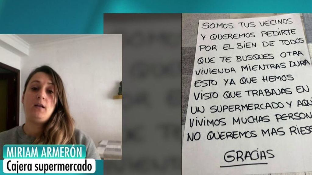 Miriam es cajera de un supermercado en Cartagena, y el otro día recibió por debajo de la puerta de su casa una nota de los vecinos donde le pedían que se buscara "otra vivienda mientra dure esto". Su hijo pequeño fue quien lo encontró y acabó llorando tras ver los vecinos no querían que estuvieran allí y pensó que les iban a echar. Le parece un poco cobarde lo que han hecho sus vecinos.