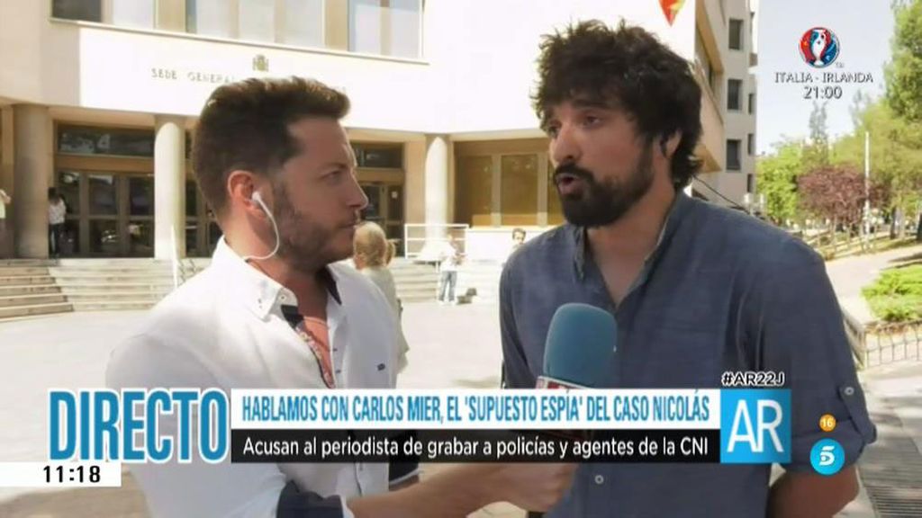 Acusado de grabar a los policías durante su reunión con el CNI en el marco del caso Nicolás, Carlos Mier ha defendido su inocencia en 'El programa de Ana Rosa' tras salir de los juzgados. "Ha ido bien y me he limitado a explicar lo que ocurrió esos días. Me limité a hacer mi trabajo, que era contrastar una información y llamar a una fuente. A partir de ahí se monta este berenjenal en el que estoy en el medio", ha dicho Mier. "Yo no acciono ningún dispositivo. Me limito a tratar de hacer bien mi trabajo. A partir de ahí se ha montado este disparate, este complot surrealista en el que estoy investigado. Confío en la justicia y en que esto acabará cuanto antes y no se lesione mi profesionalidad que es lo que más me importa".