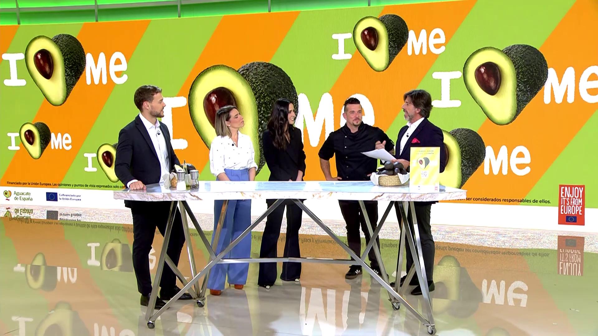 El momento final del encuentro gastronómico dedicado a los aguacates europeos tuvo un protagonista muy especial. Tras las recetas preparadas en el plató, todos los participantes recibieron a Antonio Carpintero, director general de Intertropic, la organización que impulsa la campaña ‘Aguacate y Mango de Europa: Frutas con Corazón’, co-financiada por la Unión Europea.