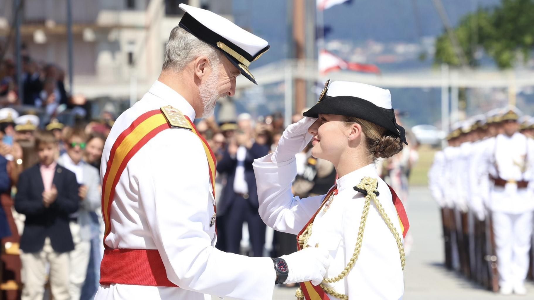De este modo, el monarca ha impuesto esta distinción a su primogénita entre risas y protagonizando un tierno abrazo, un momento que ha estado cargado de emoción para ambos y para los asistentes. Y es que el mismo Felipe cursó esos estudios militares en Marín hace más de 30 años, por lo que el acto está revestido de un valor significativo para padre e hija.