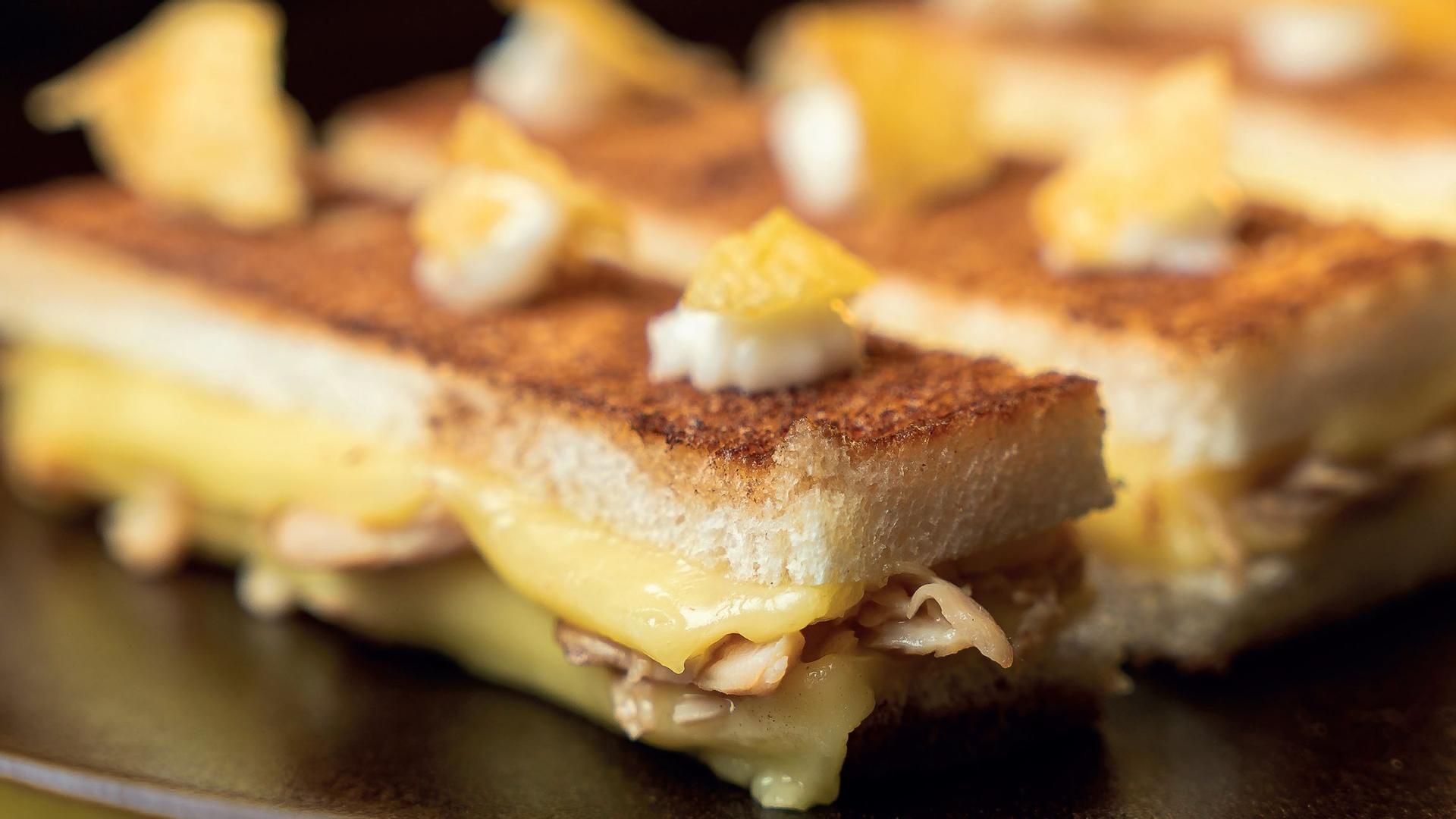 Bikini de sobrasada, queso Mahón, hierbas, miel y piñones: Dice el autor que es “el clásico bikini balear pero con el toque de hierbas, miel y piñones que lo hace muy Mediterráneo y encaja perfectamente con el sabor de las sobrasada”. Invita a ponerle un huevo frito encima.