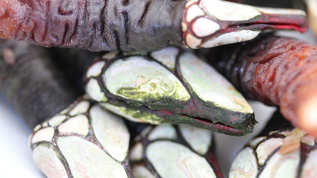 Lleva evolucionando treinta millones de años pero ha sido una evolución involutiva: aunque lo parece no es un molusco, sino un crustáceo que ha ido evolucionando hasta perder la movilidad. Igualmente, carece de branquia: capta el oxígeno disuelto en el agua a través de unos filamentos. Digamos que es un crustáceo críptico y enigmático. Reservadillo, vaya. Parece un híbrido entre el mundo animal marino y el mineral. ¿De qué consta entonces el bicho? Pues tiene dos partes: el pedúnculo (abajo) y la uña o cabeza (arriba), que se unen a través de un cuerpo salvaguardado con una piel verde oscura o negra que actúa como una cota de malla protegiendo su carne sonrosada, delicada y deliciosa.