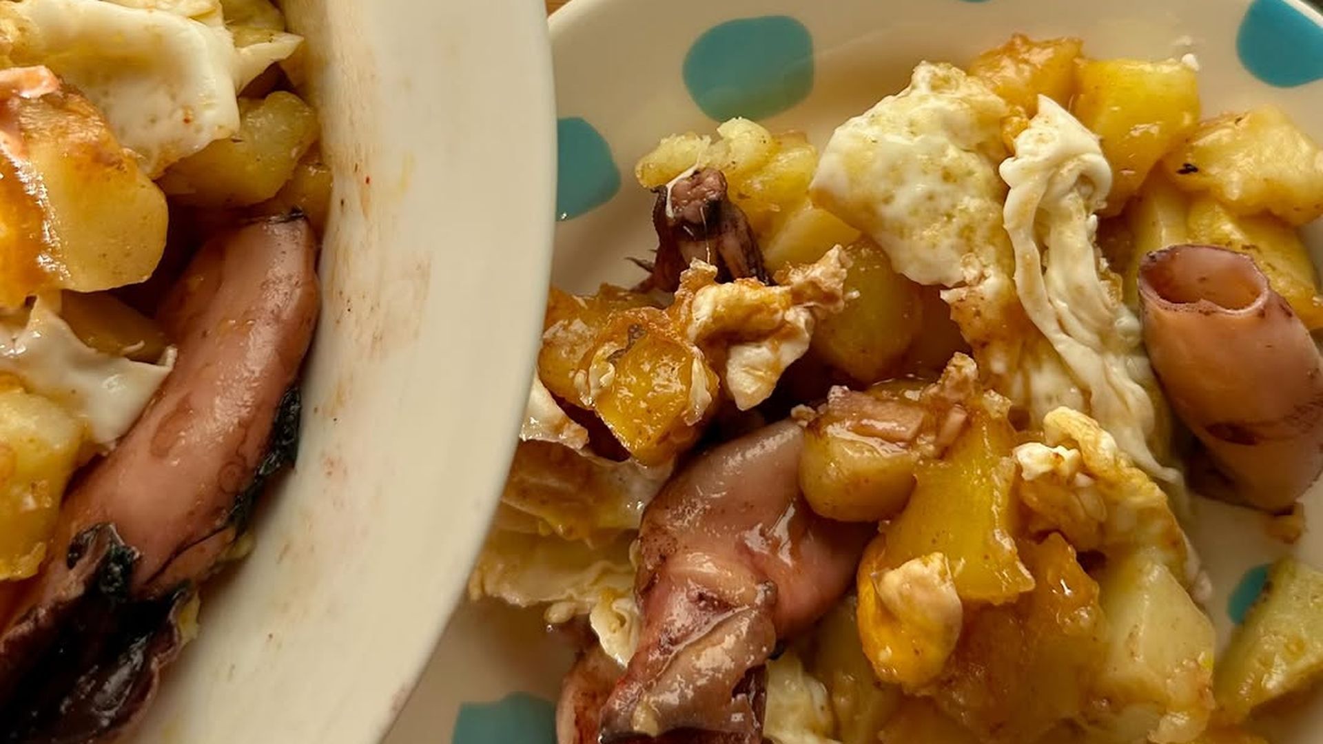 La receta de los huevos rotos con gambones y chipirones