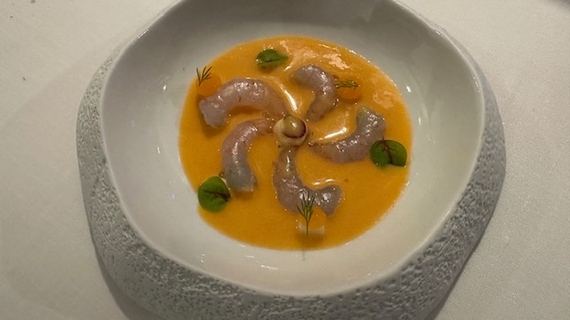 La falsa lasaña de txangurro, llegó como un poema breve: capas invisibles de mar, dulzura atlántica, un equilibrio frágil que se deshacía en la boca como una confidencia. Siguió la tortilla vaga, ese desmayo de huevo que no termina de cuajar porque prefiere entregarse al plato con pereza; una indecisión deliciosa entre lo líquido y lo eterno. Las alcachofas fritas, flores de invierno que crujían como la hojarasca, dieron paso a un salpicón de colas de bogavante que tenía algo de verano recordado en invierno, de playa interior. La merluza frita llegó escoltada por una mayonesa inverosímil, ligada con la gelatina de la propia cabeza del pez (un prodigio de colágeno y alma), para terminar en la tierra rotunda con unas mollejas doradas como el sol de tarde, que nos devolvían al territorio de la carne feliz.