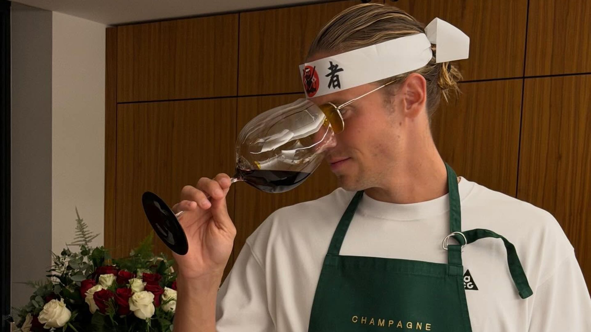 Uno de los últimos de los que ha presumido es un exclusivo vino tinto que cuesta casi 5000 euros, el elegido para el menú de sushi que él mismo cocinó con delantal, paño bordado con su nombre (chef Marcos) y hasta con un hachimaki, una cinta tradicional japonesa que se ata alrededor de la cabeza y que muchos chefs utilizan como elemento estético inspirado en la cultura nipona.