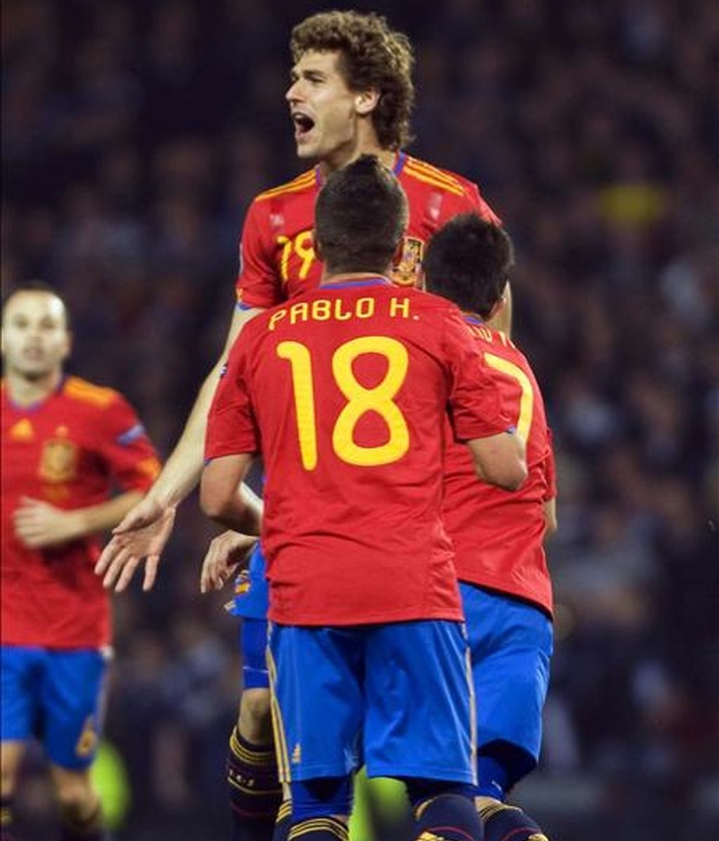 El jugador español Fernando Llorente (c, arriba) celebra con sus compañeros tras anotarle un gol a Escocia en el estadio Hampden Park de Glasgow (Reino Unido). España ganó 3-2. EFE