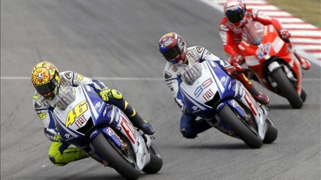 El piloto italiano de Moto GP Valentino Rossi (Fiat-Yamaha) (i) seguido de su compañero de equipo, el piloto español Jorge Lorenzo (c) , y del australiano Casey Stoner (Ducati) durante el Gran Premio de Catalunya. EFE/Archivo