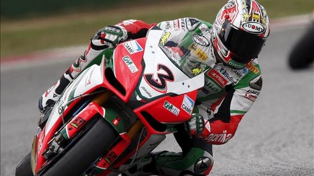 El italiano Max Biaggi participa con su Aprilla RSV4 en la sesión clasificatoria para el Mundial de superbikes, en el circuito de Kyalami, en Johannesburgo (Sudáfrica), el pasado 15 de mayo. EFE/Archivo