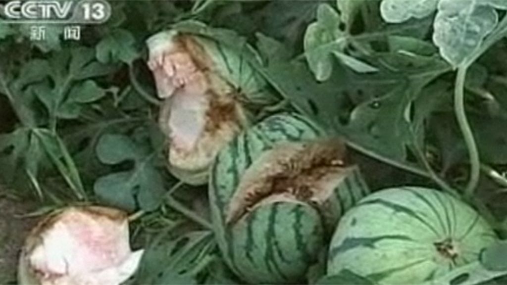 Las sandías explosivas devastaron unas 45 hectáreas de cultivo en Danyang, provincia de Jiangsu en China. Los agricultores aplicaron demasiado fertilizantes y el resultado fue un desastre. Foto MSBN