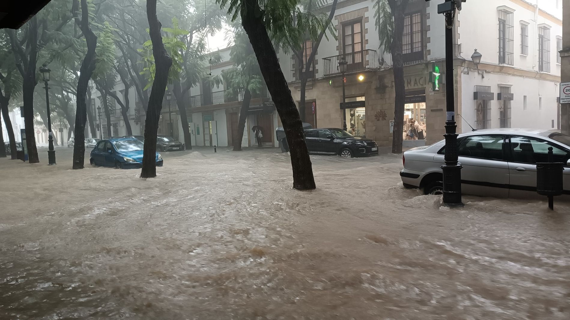 Las inundaciones en calles del centro de Jerez como Porvera, Alameda Cristina, calle Larga o Honda, están provocando colapsos en el tráfico, que se repiten en otros puntos de la ciudad como la entrada sur por Cuatro Caminos, la barriada de La Granja y en la salida de los colegios.