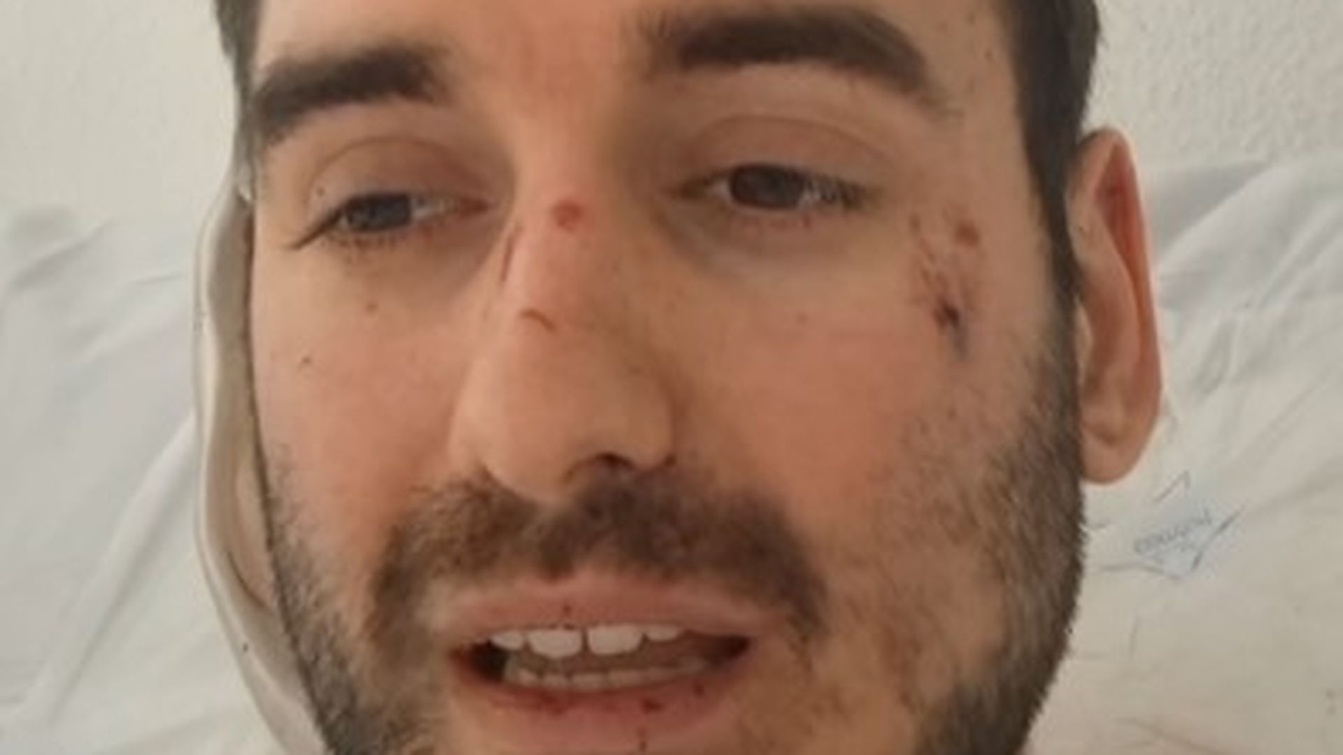 La cara muestra las heridas causadas en la tragedia de Adamuz que le han ocasionado también la rotura de la tibia y el peroné. Es el relato de Gonzalo, que viajaba en el vagón número uno con destino a Huelva  uno de los supervivientes desde el hospital donde se recupera de un día que nunca olvidará. "Ha sido un accidente muy trágico, parecía un infierno, había muchos heridos graves. Por suerte estoy vivo". Relata que un convoy chocó contra otro. "Estoy contento de estar vivo".