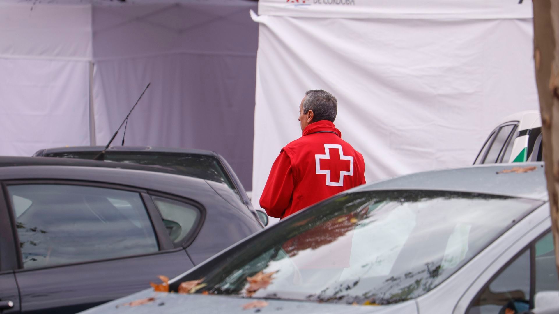 Un empleado de la Cruz Roja este jueves en el centro cívico Poniente Sur de Córdoba. EFE