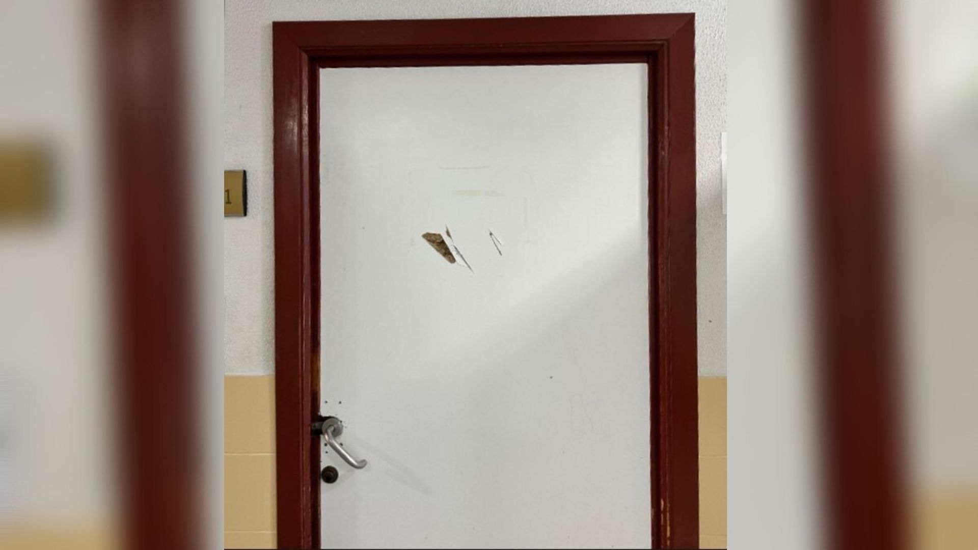 Estado en el que quedó la puerta de la consulta en la que se atrincheraron los sanitarios
