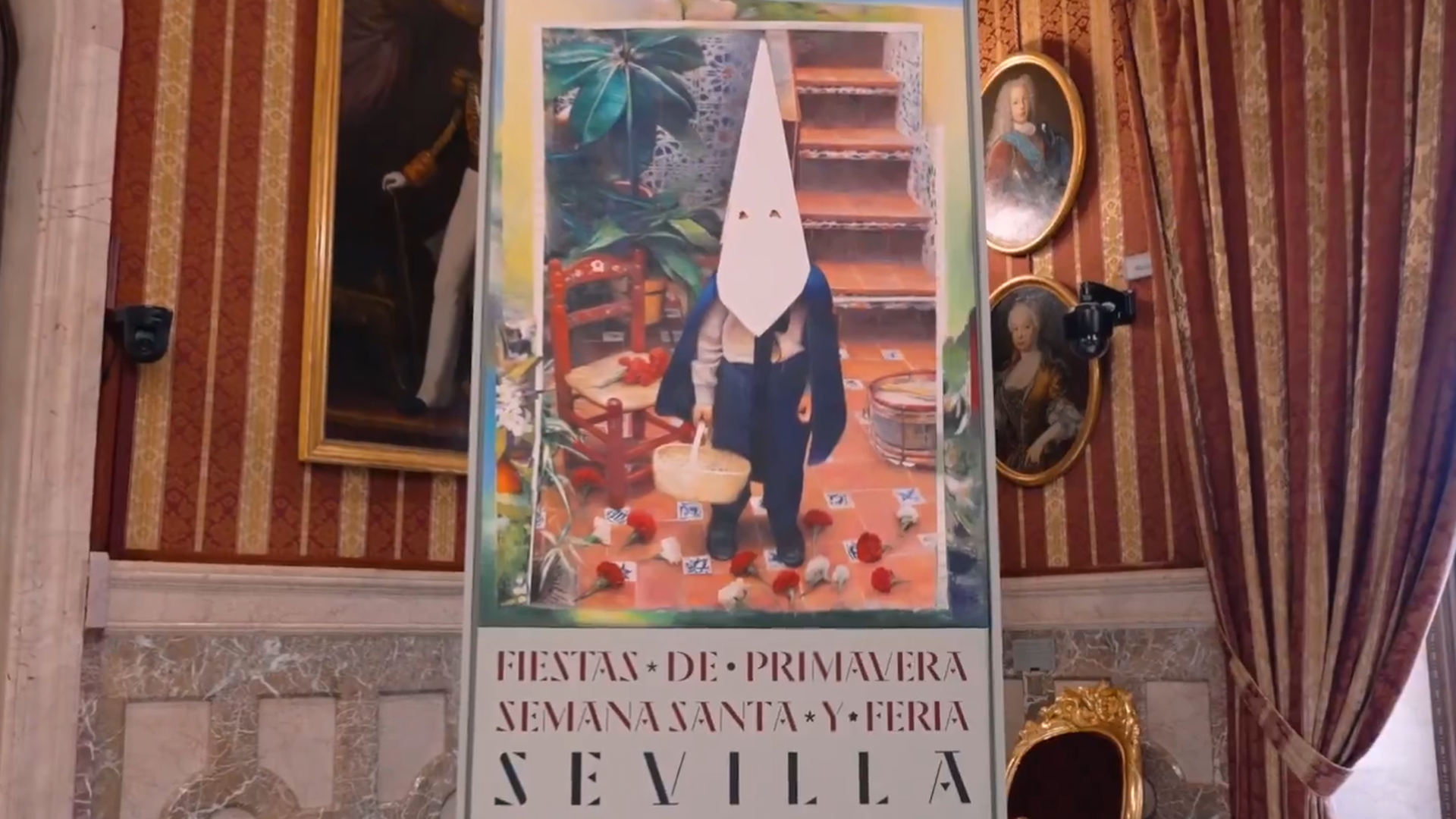 El pequeño, con una cesta en la mano, está en un patio tradicional de azulejos rojos. Rodeado de claveles rojos y blancos, una antigua silla de enea y un tambor, su autor Daniel Franca quería evocar su infancia en Sevilla.