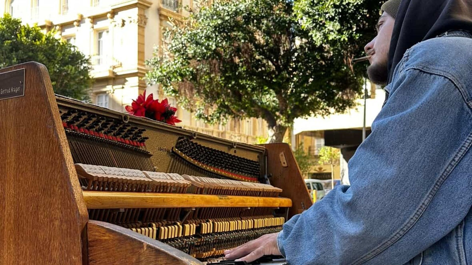 Su piano colocado junto a un paseo peatonal en obras nos recuerda a iniciativas como el escenario al aire libre que hubo en Bilbao en el año 2025. Tocando sus teclas, Max Maas puso sonidos más atractivos que los ruidos de la maquinaria trabajando.