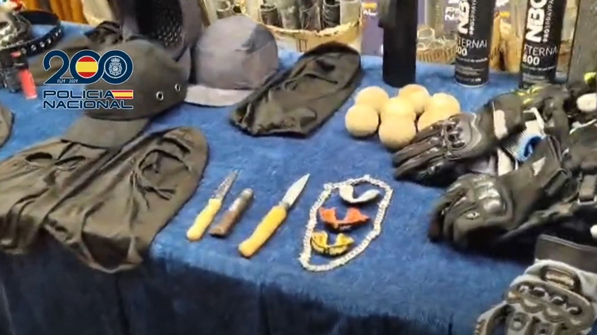 Transportaban un cuchillo, 51 palos de madera que simulaban banderas, numerosos pasamontañas, dos cadenas, espráis de pintura, un protector bucal y una funda de pistola, entre otros objetos.
