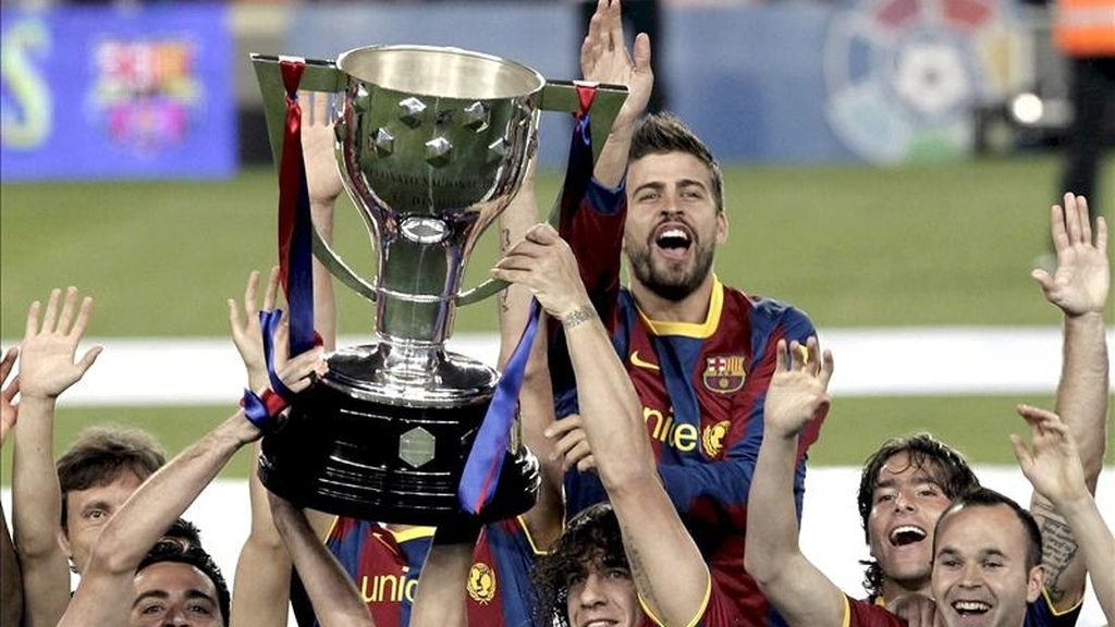 Los capitanes Carles Puyol y Xavi Hernández han sido los encargados de recoger el preciado trofeo, que por vigésimo primera vez recibe el club catalán, y lo han acercado al centro del campo donde estaba toda la plantilla azulgrana y cuerpo técnico.