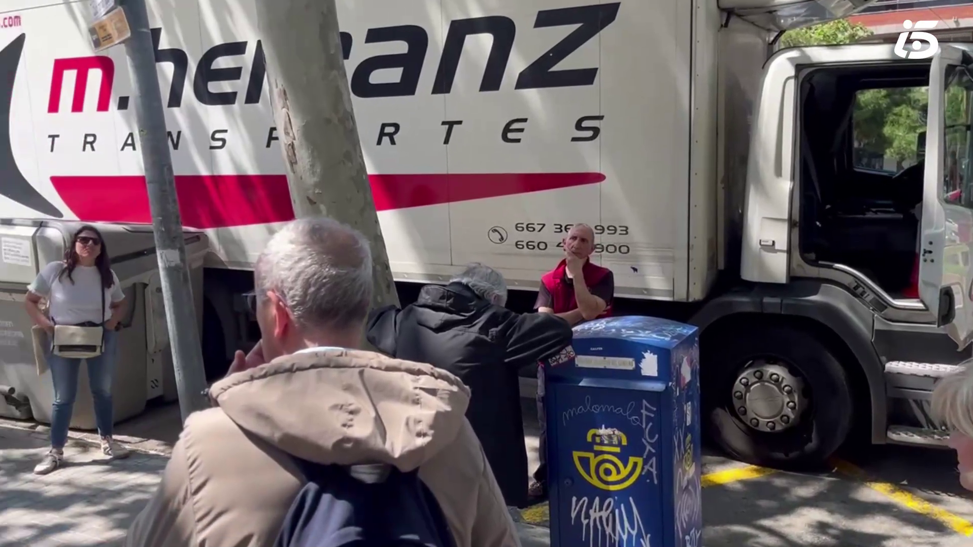 El conductor del camión ha estacionado el vehículo en la carretera de una calle de Barcelona, con la radio a todo volumen