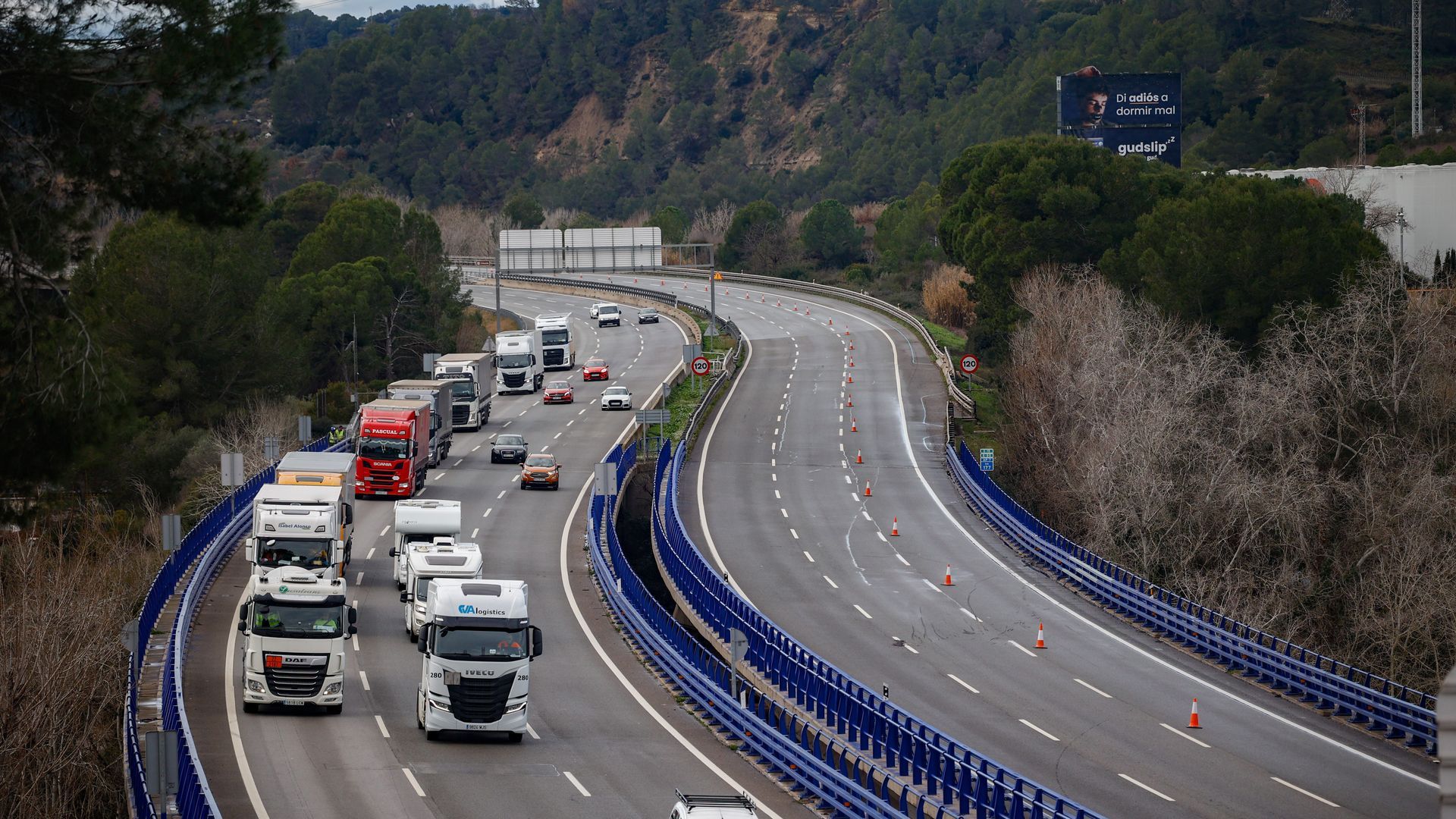 Vehículos circulan por la AP-7 que ha sufrido cortes tras el accidente de tren entre las estaciones de Sant Sadurní d’Anoia y Gelida. Europa Press