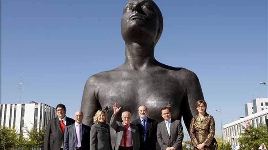 El escultor Antonio López (c) posó delante de "La mujer de Coslada", su nueva obra escultórica, durante la inauguración oficial que tuvo lugar hoy en la ciudad madrileña. Se trata de una escultura en bronce de cinco metros de alto, 3.000 kilos de peso y 40 piezas soldadas que componen una figura femenina de gran tamaño. EFE