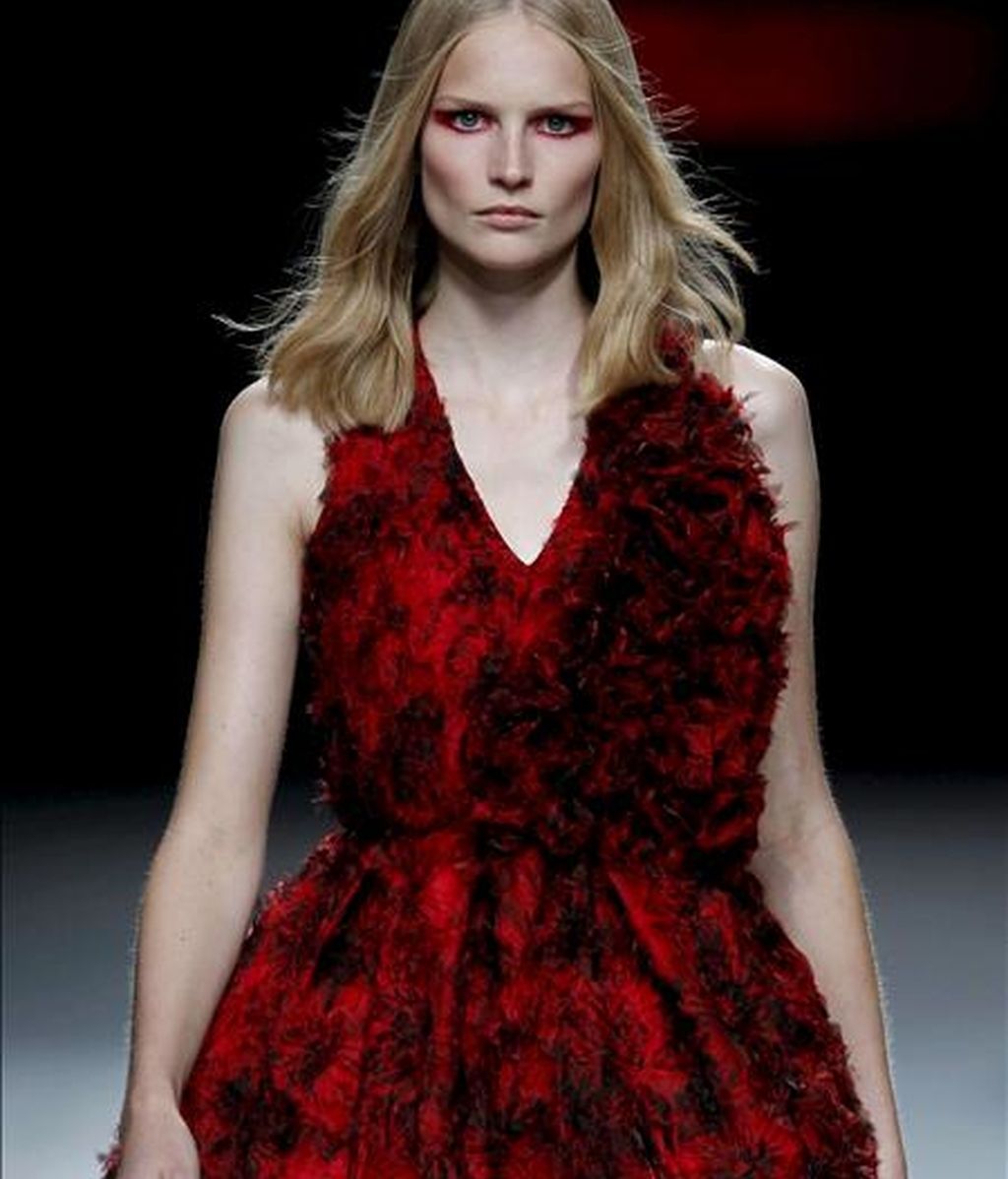Una modelo luce las creaciones de la diseñadora burgalesa Amaya Arzuaga durante la presentación de su colección primavera/verano 2011, en la última jornada de Cibeles Madrid Fashion Week. EFE