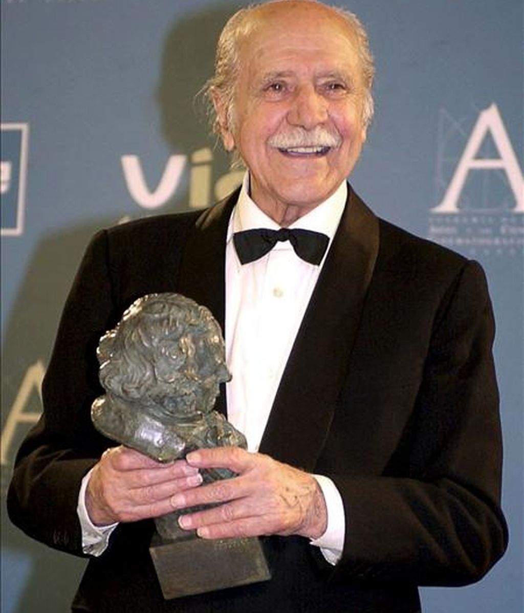 Imagen de archivo (01/02/2003) del actor madrileño Manuel Alexandre posando con el Goya de Honor por su trayectoría laboral, durante la XVII edición de los Premios Goya del cine español. EFE