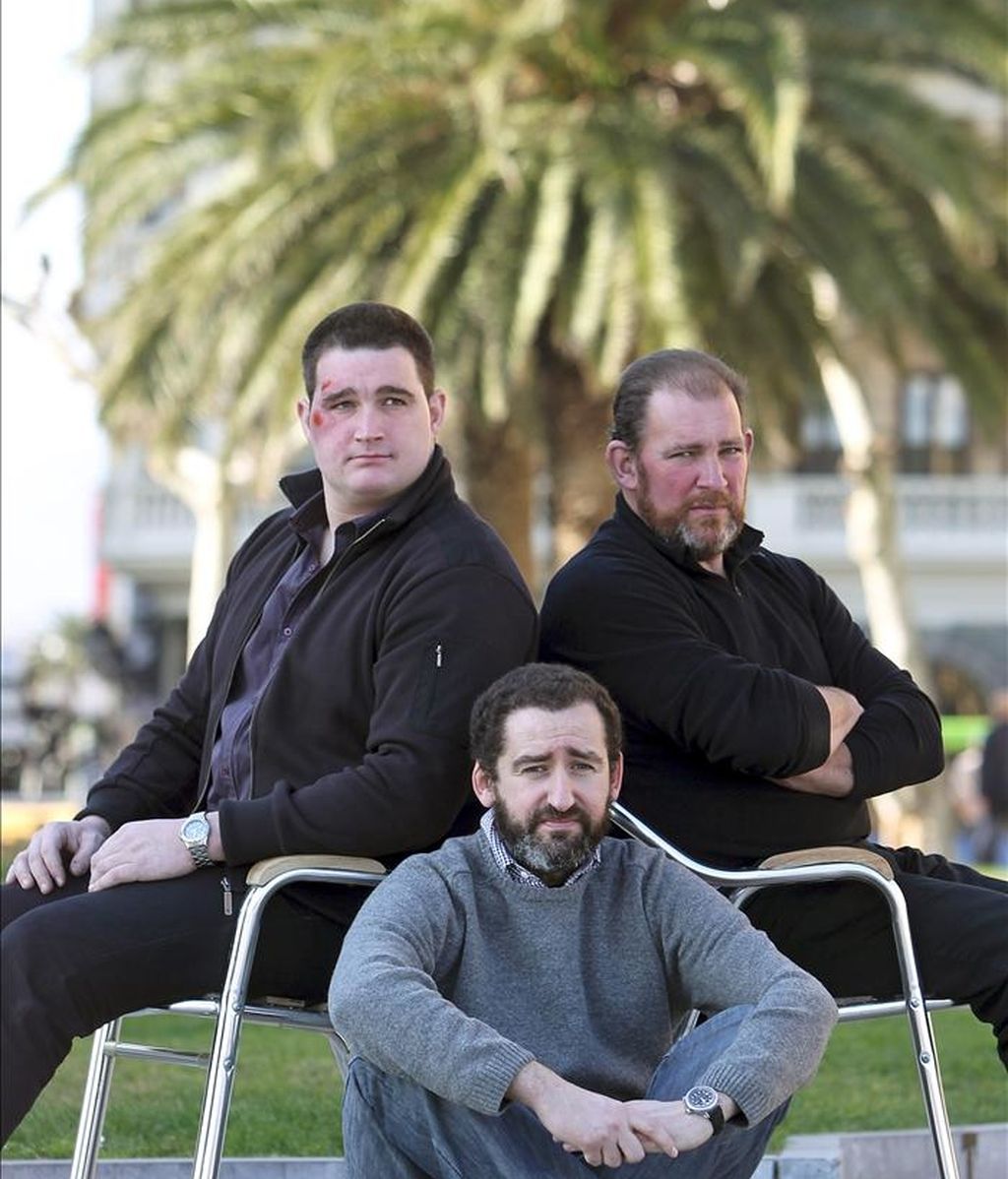 Los harrijasotzailes (levantadores de piedra), Iñaki (d) e Inaxio Perurena (i), posan junto al director, Jon Garaño (c), antes de presentar el estreno del documental "Perurena". EFE