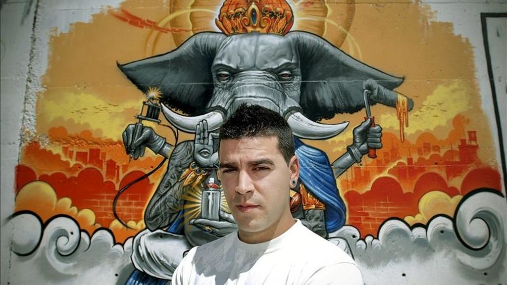El granadino Javier López "Drew" posa ante su obra titulada "El elefante" con la que ha conseguido el primer premio en la final del séptimo Certamen andaluz de Graffiti que se ha celebrado en la localidad jiennense de Linares. EFE