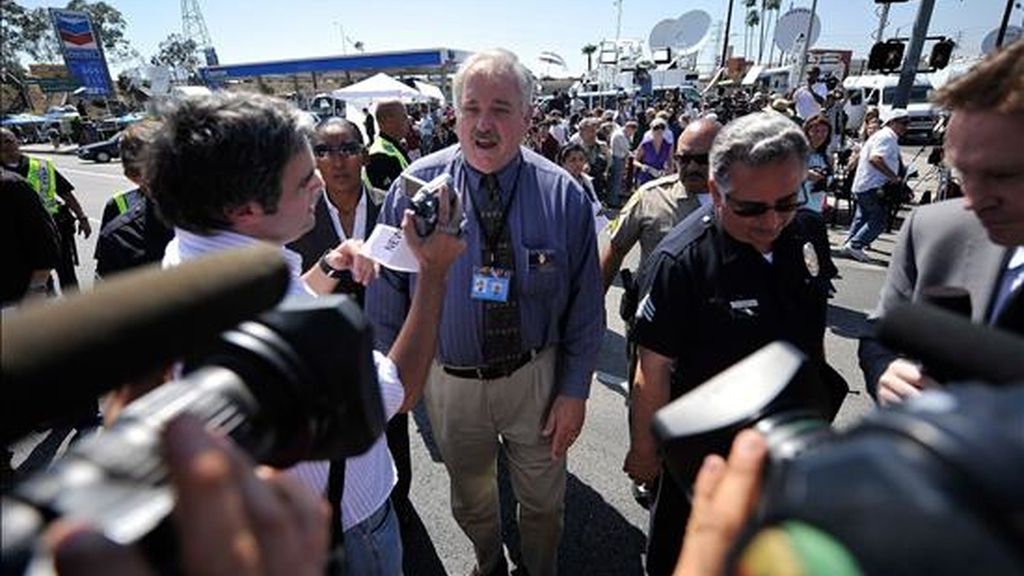 El jefe de operaciones del equipo forense de Los Ángeles, Craig Harvey, habla con la prensa en esa ciudad californiana (EE.UU.), después de que se completaran 3 horas de la autopsia al cuerpo del cantante estadounidense Michael Jackson. EFE/Archivo