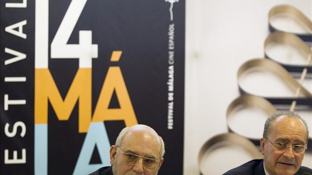 El director del Festival, Carmelo Romero (i) junto al alcalde malagueño, Francisco de la Torre, durante la presentación del cartel anunciador de la XIV edición del festival de Cine Español de Málaga, que se celebrará del 26 de marzo al 2 de abril en la capital. EFE/Archivo