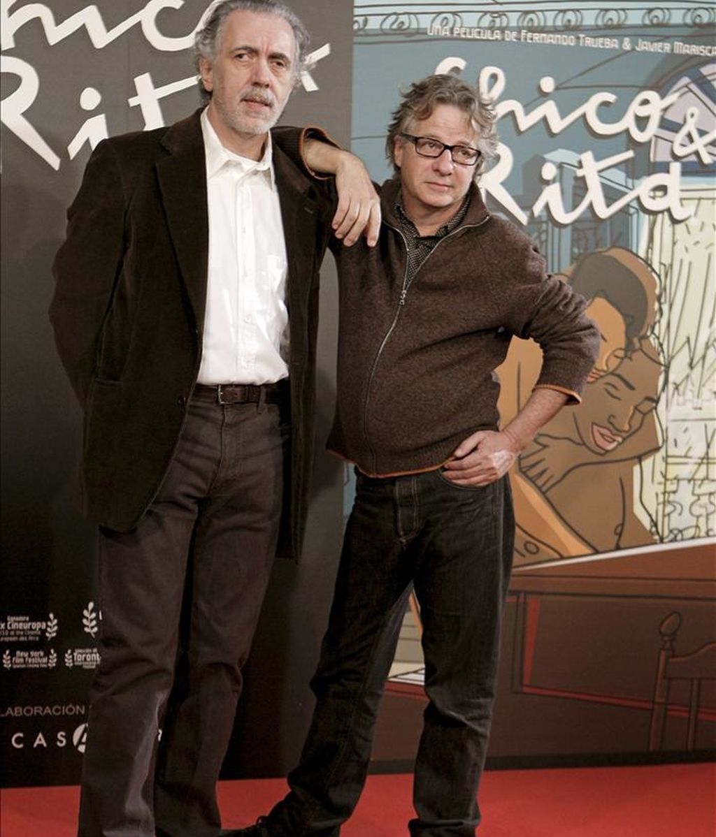 El cineasta Fernando Trueba (izda) y el diseñador Javier Mariscal, durante la presentación de "Chico & Rita", ganadora del Premio Goya a la mejor película de animación, en la que, con música de Bebo Valdés, cuentan la historia de amor entre un pianista y una cantante que pasan sus vidas entre Nueva York y La Habana. EFE