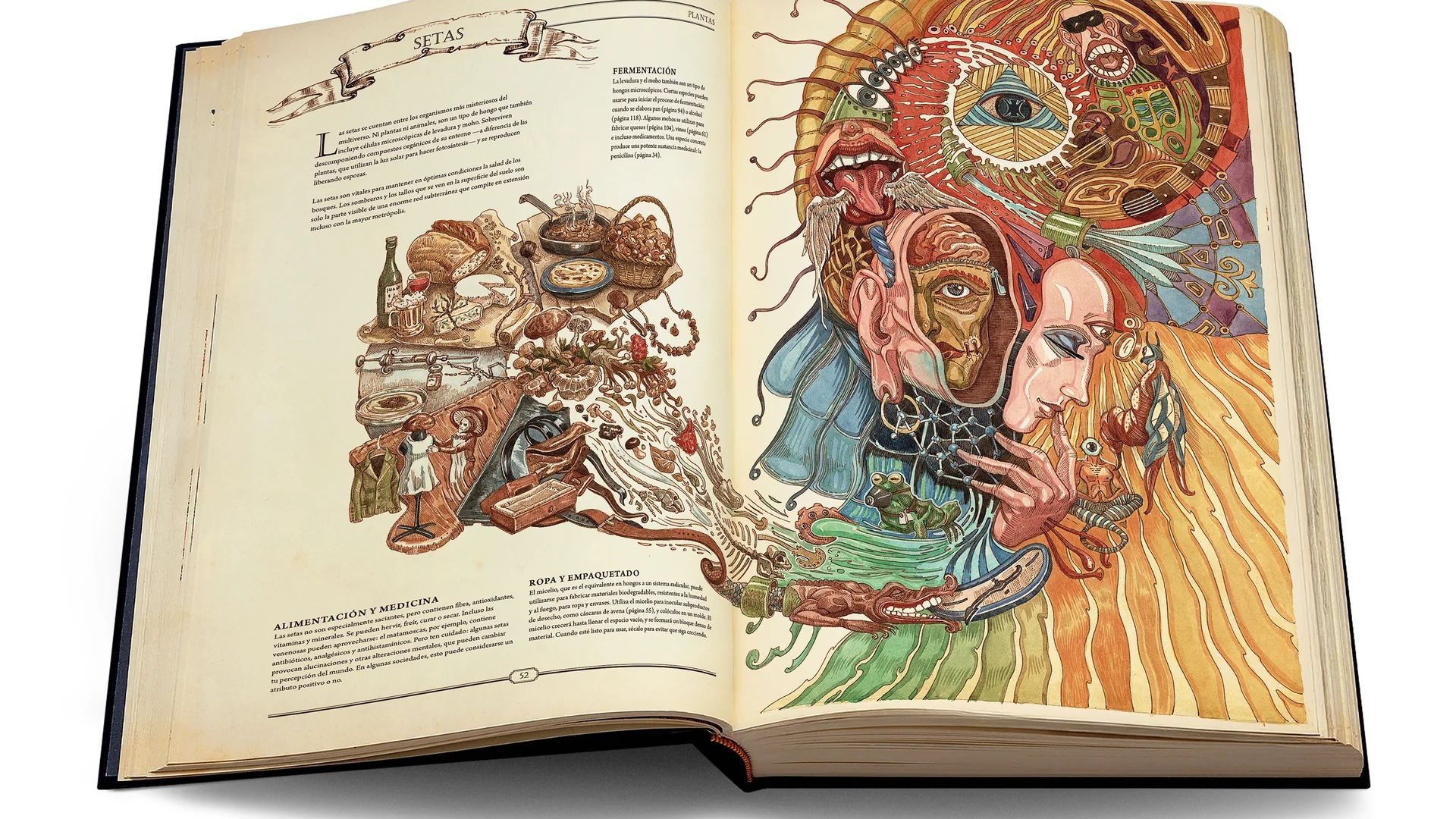 Y una vez que abrimos el libro no deja de llamar la atención, ya que su propuesta reúne nada menos que más de 700 ilustraciones, detallistas, coloridas, a ratos con un aire retrofuturista y, en algunas páginas, con guiños steampunk. No es un adorno: es parte de la experiencia. Se mira tanto como se consulta.