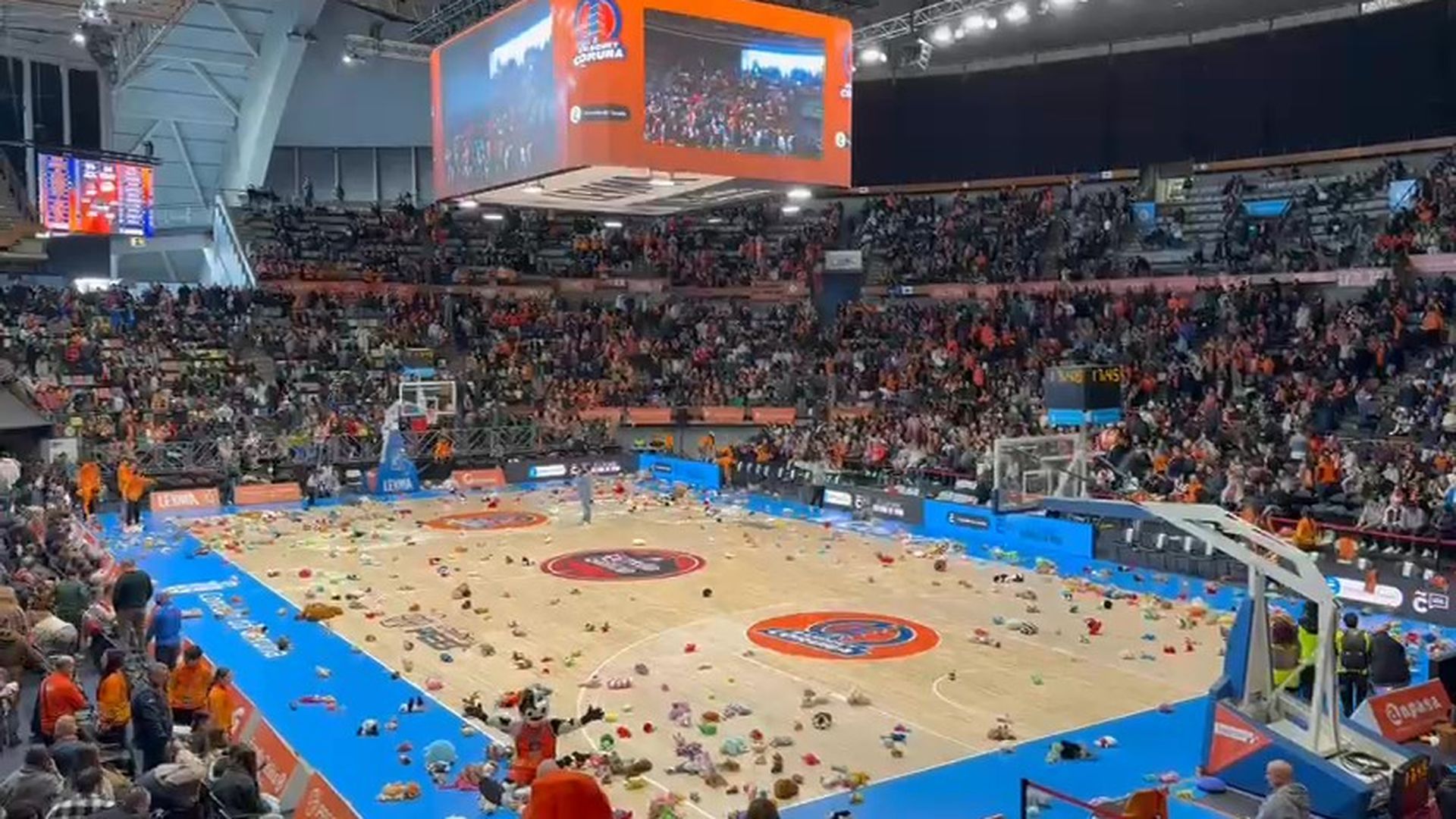 Lluvia solidaria de peluches en el partido de baloncesto del Leyma en A Coruña
