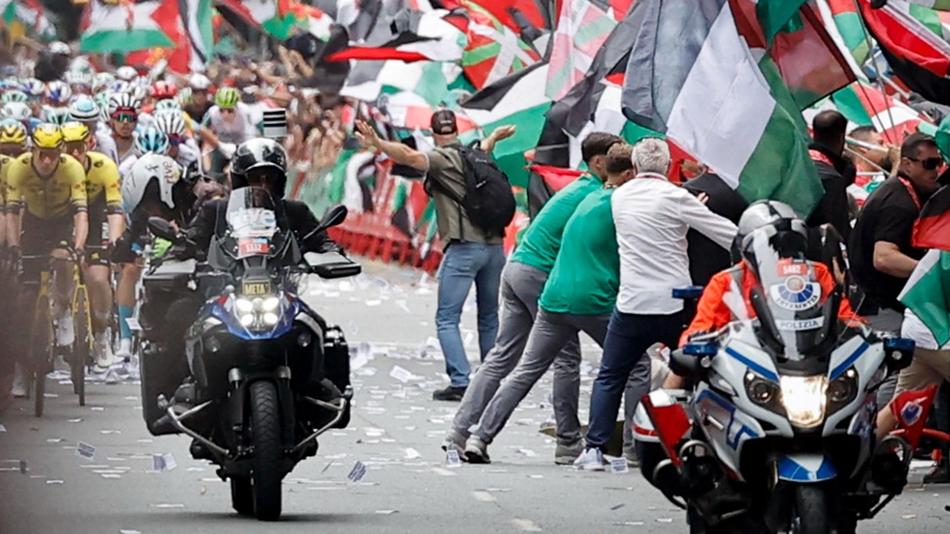 A escasos metros del pelotón, grupos de manifestantes propalestina trataron de cortar el paso a los corredores, lo que convirtió el último tramo de la undécima etapa, con meta en Bilbao, en un escenario caótico.
