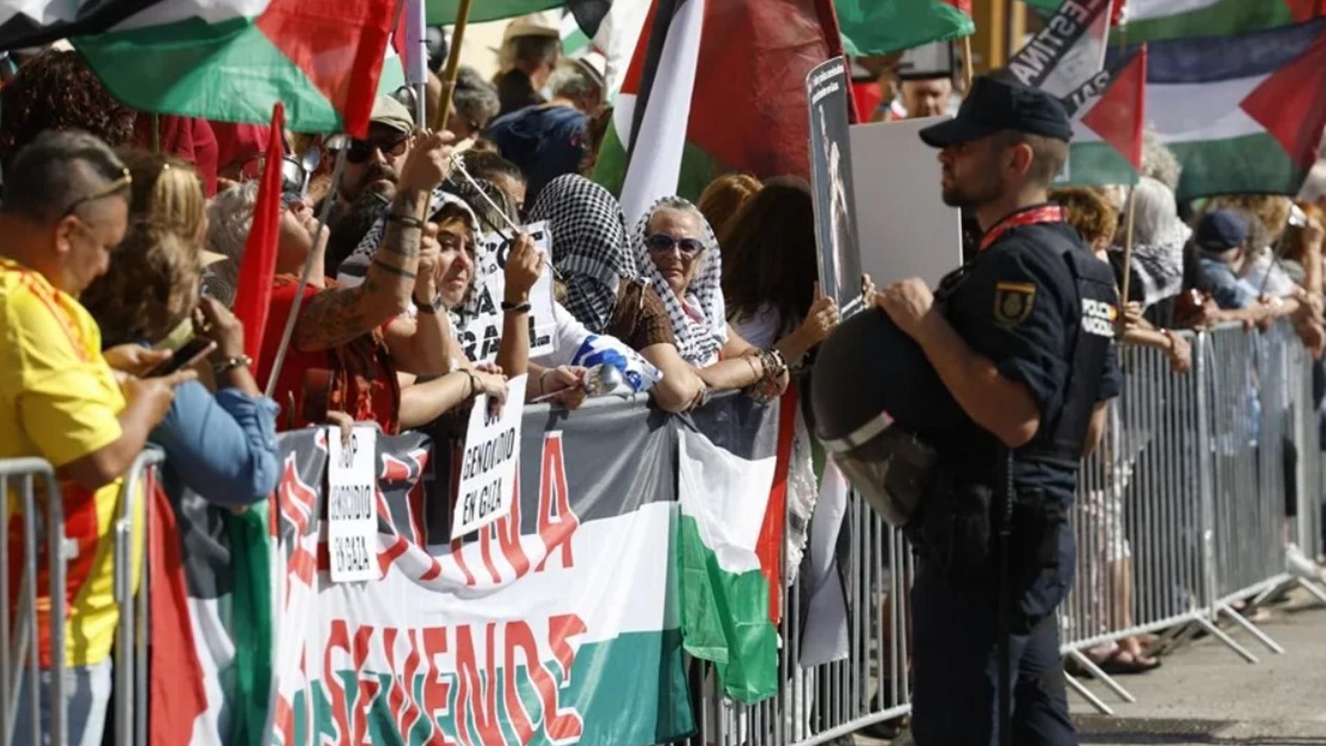 La cacerolada ha comenzado sobre las 10:00 horas frente al ayuntamiento de la localidad cántabra, en cuyo balcón colgaba una bandera de Palestina, y ha continuado en la calle de la ciudad desde el punto de salida del pelotón hacia una de las etapas más importantes de la Vuelta, la que finaliza en el mítico alto asturiano de L'Angliru.