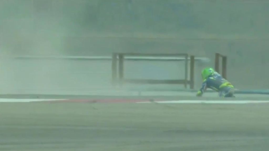 El piloto español se fue al suelo y tras levantarse, sólo pudo ver cómo el fuego devoraba su moto. Toni Elías no sufrió ningún daño y se reincorporó rápidamente.