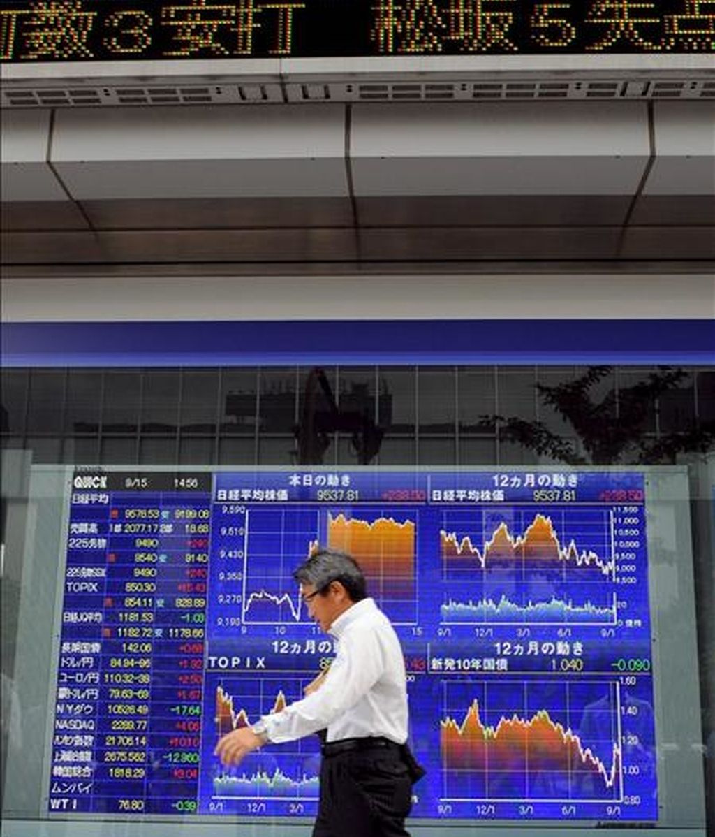 Un hombre camina frente a un tablero electrónico en Tokio que muestra las cotizaciones de la bolsa de valores. El ínidice subió 33,86 por ciento, el 0.36 por ciento en la apertura del mercado. EFE/Archivo
