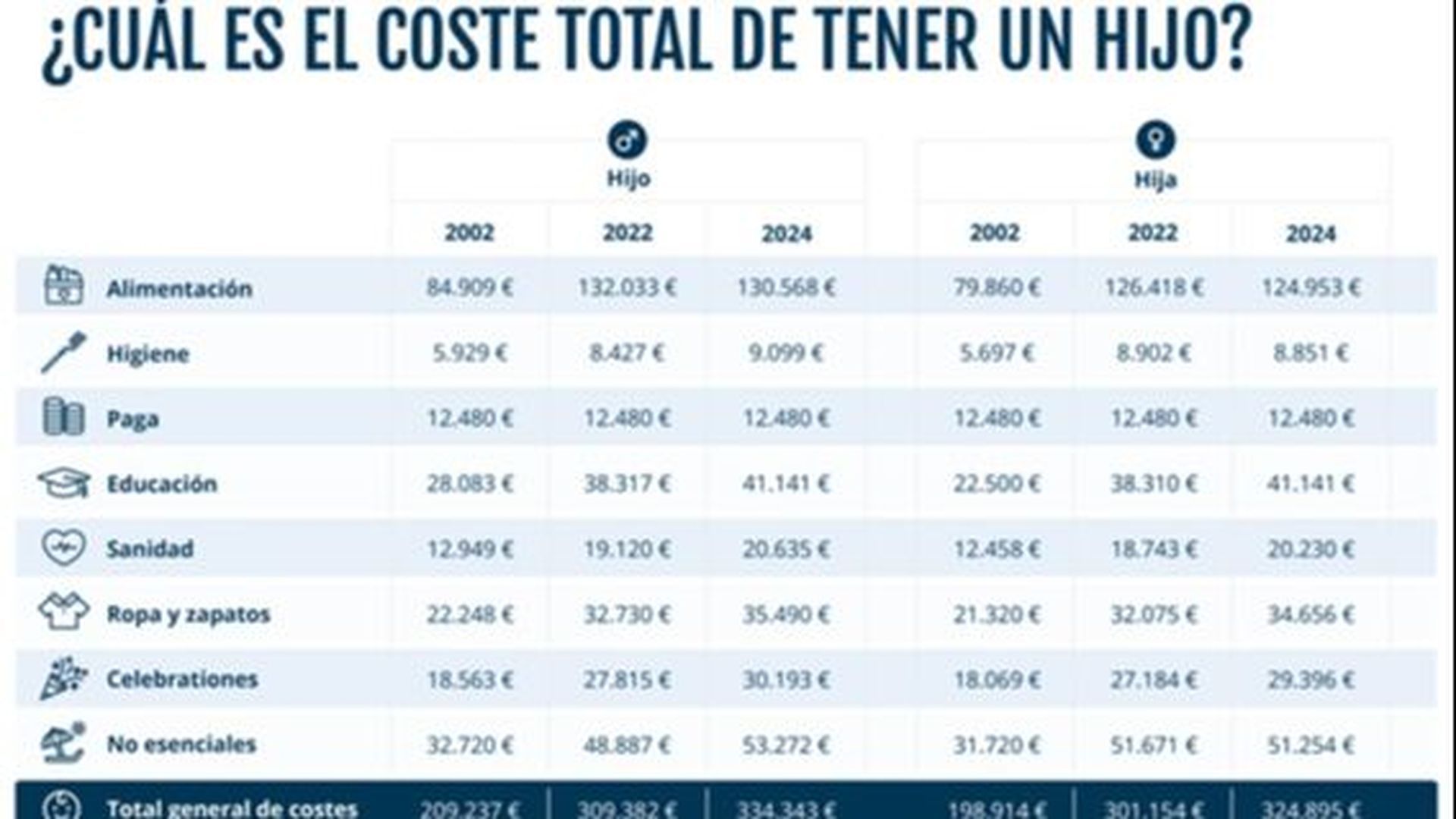 Uno de los estudios más citados estima que en España criar a un hijo o hija desde el nacimiento hasta los 31 años puede costar más de 330.000 euros, dependiendo de cuánto tiempo permanezca bajo la economía familiar.