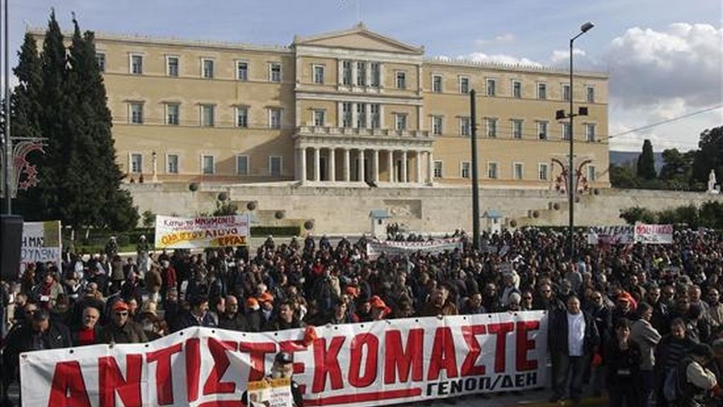 Miles de trabajadores abandonan sus puestos y se concentran frente al Parlamento para manifestarse hoy contra el programa de austeridad económica planteado por el Gobierno, en Atenas (Grecia). EFE