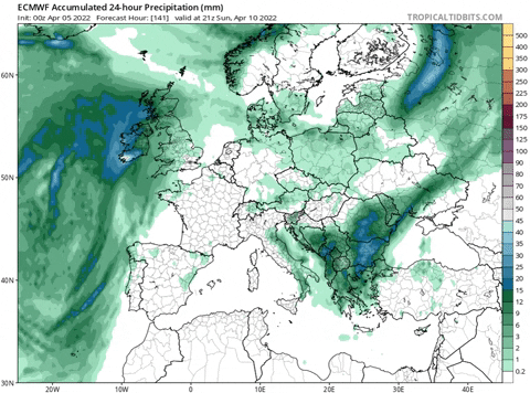 *Precipitación prevista para el lunes 11 y martes 12 de abril / ECMWF / Tropical Tidbits