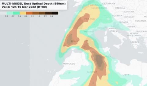 A partir de viernes la nube de polvo sahariano se moverá por áreas dispersas de la Península y se adentrará ligeramente en Canarias, y permanecerá en mayor medida en Baleares, el sureste peninsular y las ciudades de Ceuta y Melilla. No obstante, las cantidades de calima serán ya mucho inferiores que en días anteriores. En Valencia, eso sí, las Fallas se verán pasadas por aguas (y por barro) durante todo el fin de semana.