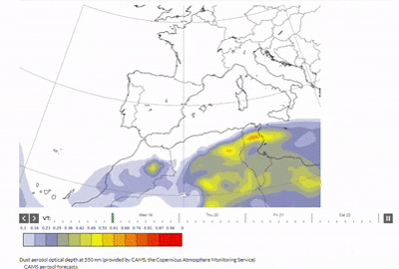 La masa de polvo se irá retirando de las islas Canarias a lo largo del fin de semana, cuando podrá trasladarse a zonas del sur peninsular y Baleares.