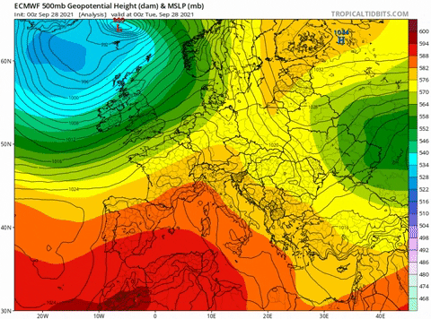 *Temperatura y geopotencial 500 hPa prevista por el modelo ECMWF / Tropical Tidbits