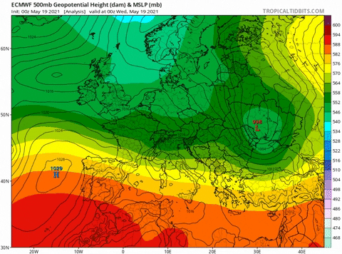 *Temperatura y geopotencial a 500 hPa prevista por el modelo ECMWF / Tropical Tidbits